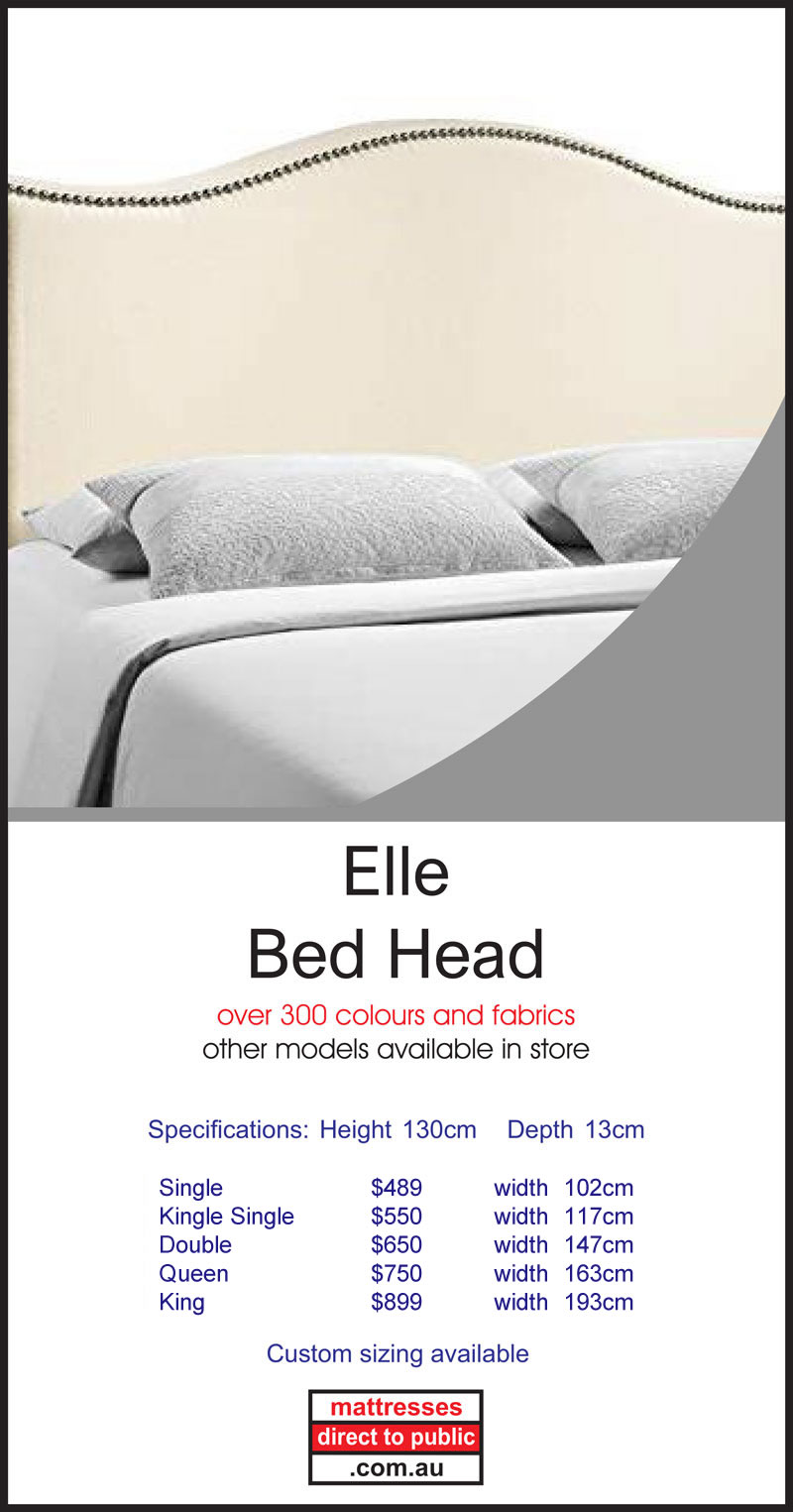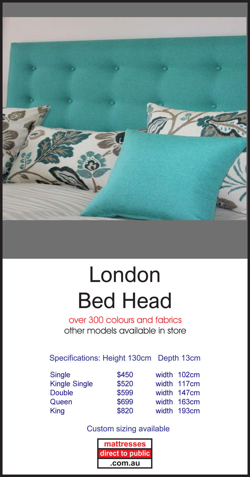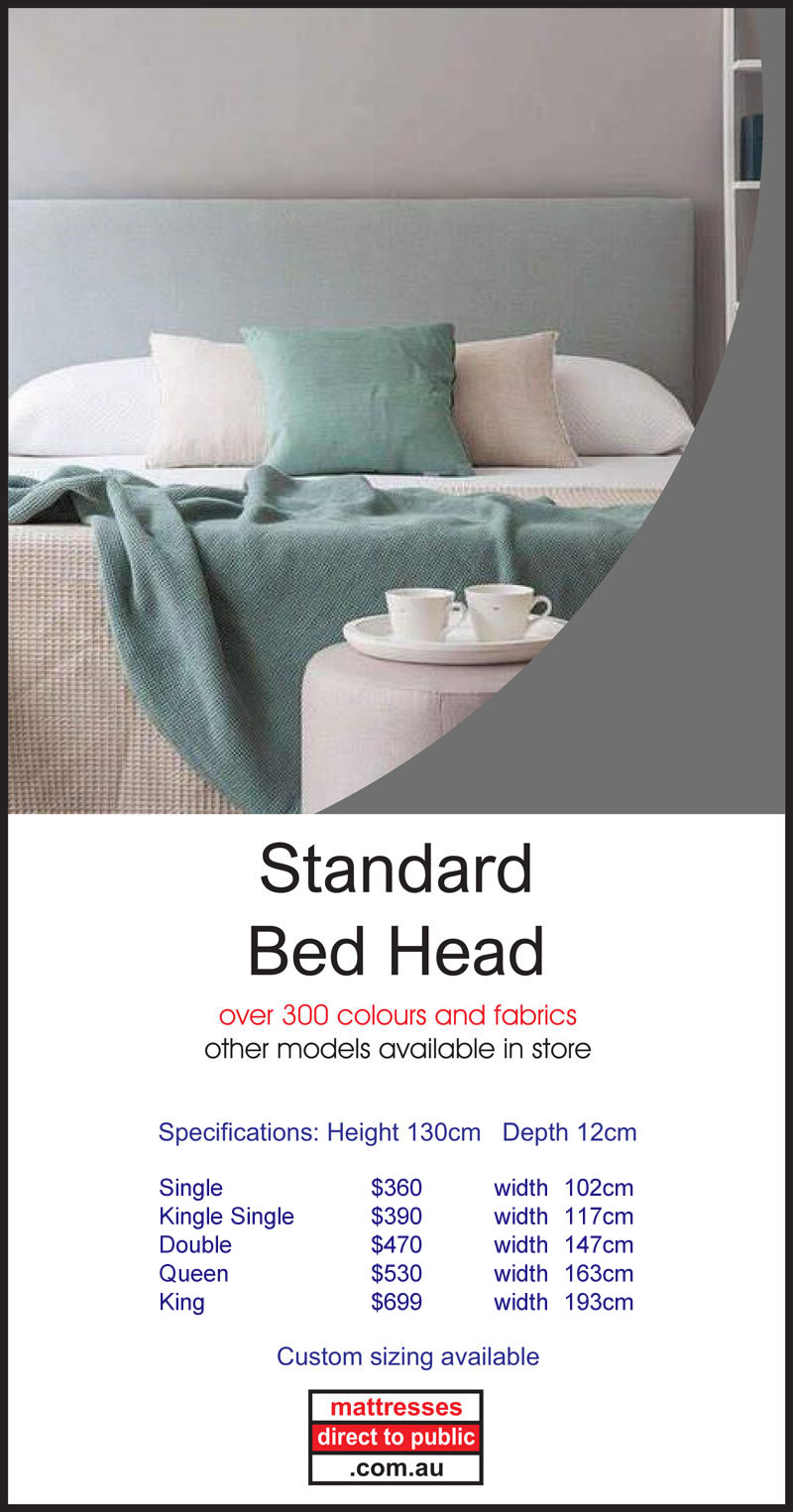 At Mattresses Direct to Public we also produce a quality made to order range of Bed Heads. They can be made in a number of sizes including King, Queen, Double and Single beds. These come in a wide variety of fabrics and styles to suit your tastes and requirements including linen, padded and modern. We also have novelty bed heads and bases to suit the kids, both boys and girls. We also have a range of matching bases that include the option of built in drawers. You can also choose from a wide range of feet with casters and slider styles. Head into our Melbourne Showroom and check out the displays.