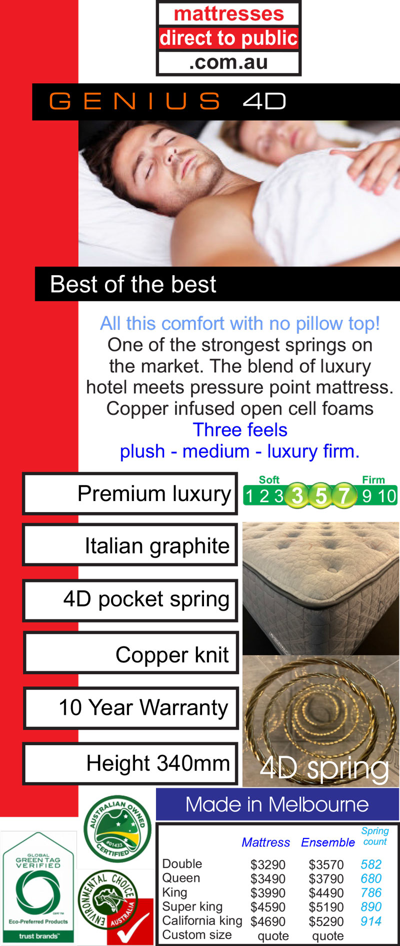 Head into our Melbourne Showroom and experience our massive range of pocket spring mattresses. We’re sure to have a pocket spring mattress that will suit your Mattress needs. From our Luxury range to our Cool Organic, Twin Coil and Sensor Flex Ranges. We have mattresses to suit both him & her all offering the support your body needs. From Plush to Firm we can supply you with a mattress that will suit your taste in comfort without breaking the bank.